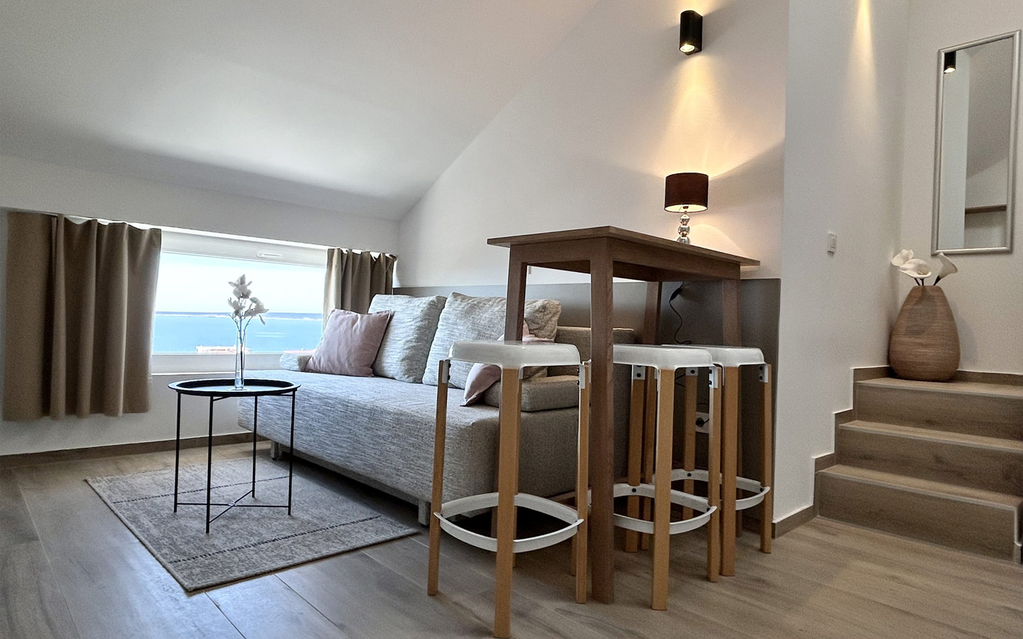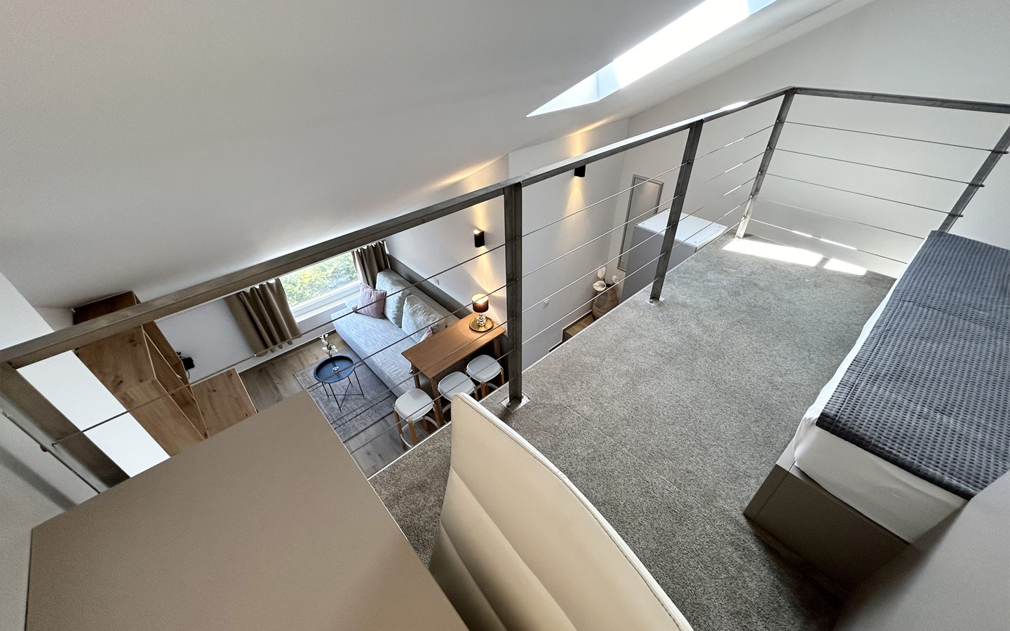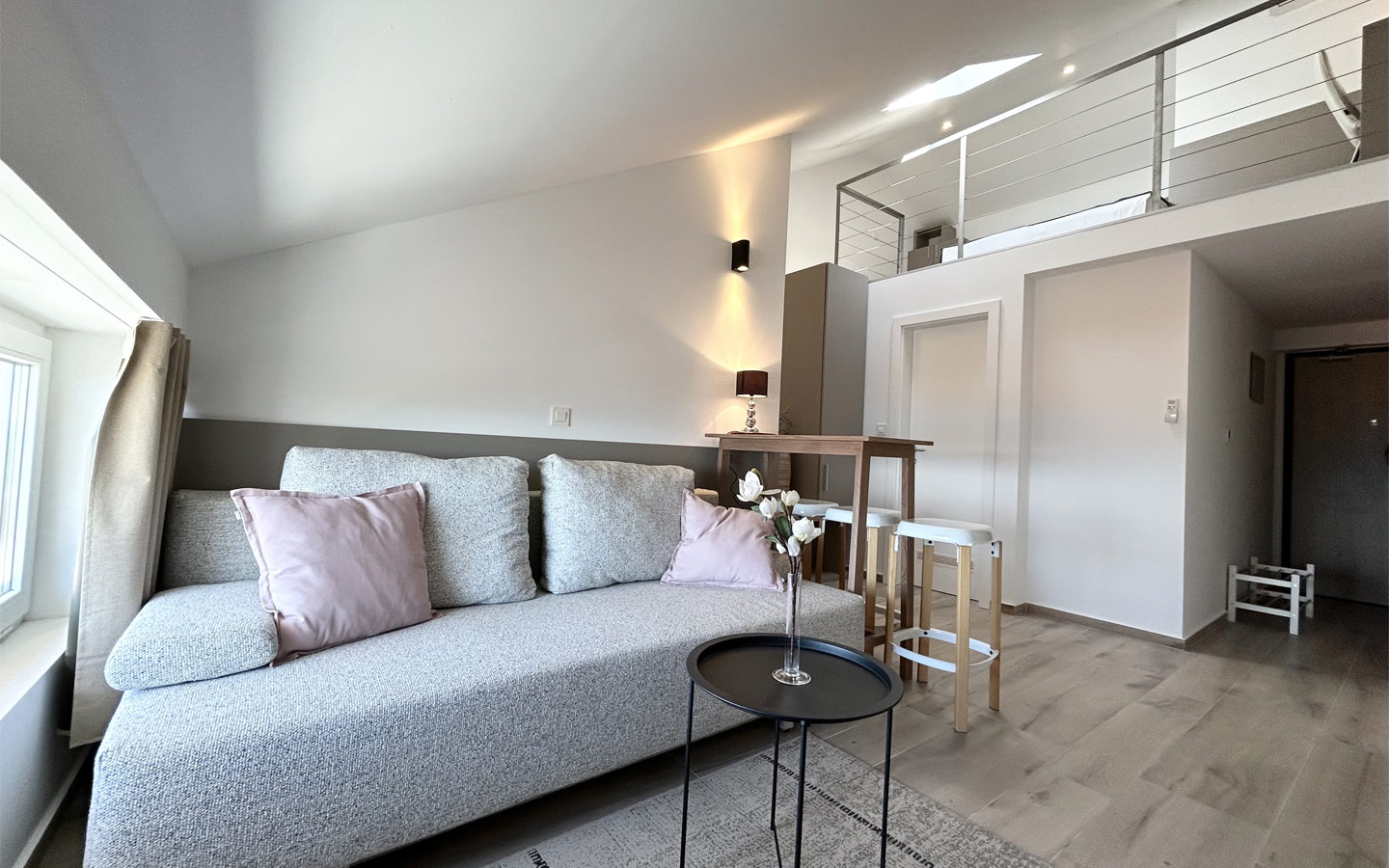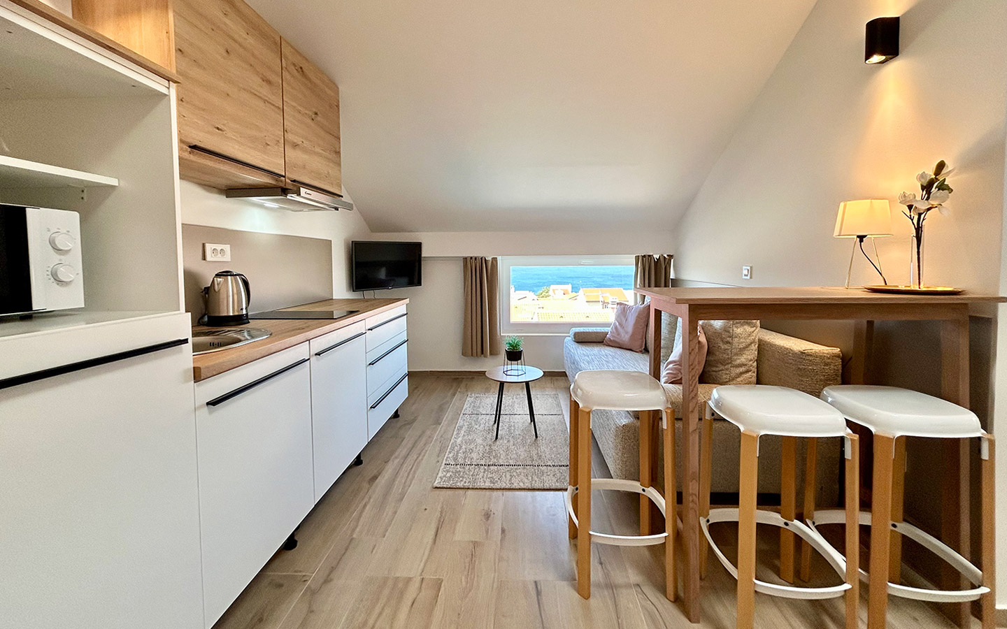 Moderno uređen dvoetažni studio apartman za do četiri osobe sadrži sobu s bračnim krevetom, kupaonu, kuhinju, blagovaonu i dnevni boravak s kaučem na razvlačenje, dizajniran za potpuno opuštanje i poseban ugođaj. Apartmanom prevladavaju svijetli tonovi, a uređenje i detalji učinit će da se svaki gost osjeća luksuzno i posebno. Apartman je opremljen s LCD TV-om i klima uređajem, a kuhinja sadrži frižider, mikrovalnu pećnicu, štednjak, perilicu posuđa, kuhalo za vodu te ostali pribor namijenjen za kuhinju. U moderno uređenoj kupaoni dočekat će vas ručnici od 100% pamuka, sušilo za kosu, sapun te proizvodi za njegu tijela. Apartman ima mogućnost korištenja zajedničke terase s vanjskim bazenom kao i ostalih sadržaja u objektu – teretana i igraonica. Apartman nosi oznaku četiri zvjezdice.